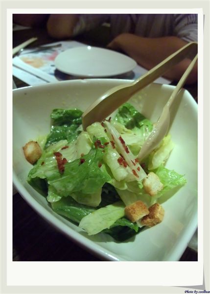 凱撒沙拉,使用蘿蔓菜淋上凱撒醬,搭配煎得焦香的培根及麵包塊,三人一盤分食。