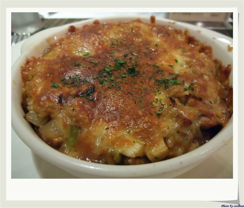 熊點的主餐:日式咖哩蔬菜雞肉焗飯,份量不會很多,咖哩飯很入味,搭配表層的焗醬,用湯匙舀起來還會牽絲,相當好吃的一道主食,吃了會有幸福的感覺唷
