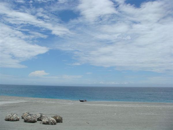,吳大爺很認真的開著車,我也很認真的把眼睛閉起來,哈哈。二個多小時後,我們來到美麗的後山,第一站就來到七星潭,呦呵,藍天大海,真令人心曠神怡啊!但是,太陽好毒辣啊!一下車我就覺得好像在烤熊肉似的,熱呼呼的,看到有阿伯在賣把哺,很興奮的跑去買,沒想到居然是個大地雷